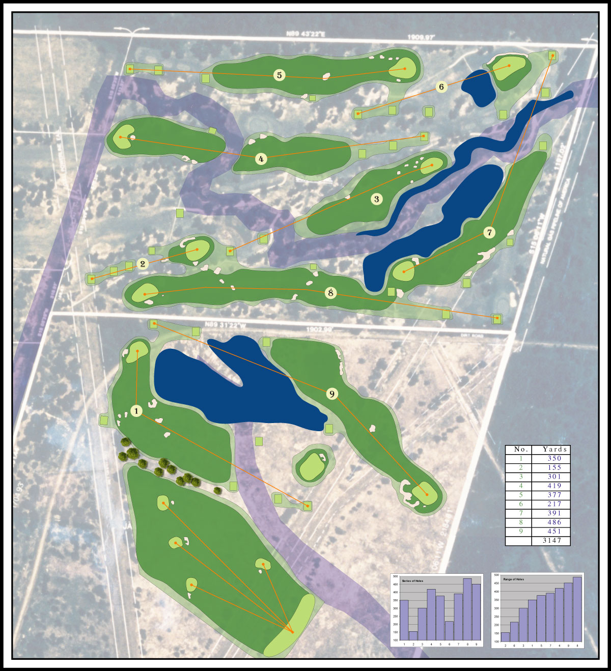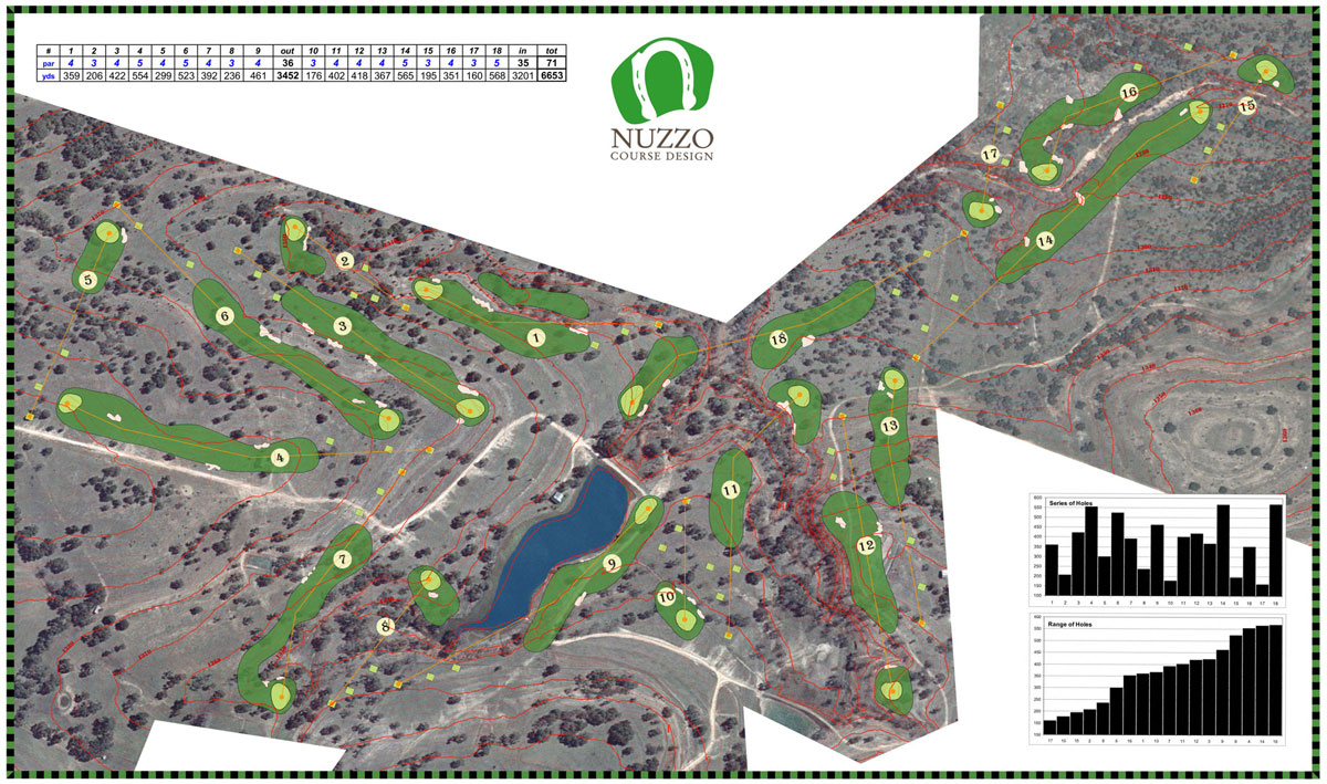 Blanco Golf Club - Texas Baxter Spann was asked to route a development course on 750 acres. To support the project, I created a core golf plan as an alternative. Alas, the maximized lot premium plan was chosen. Note constant variation of hole par throughout the round and the distributed hole lengths by clicking the image to the right. |