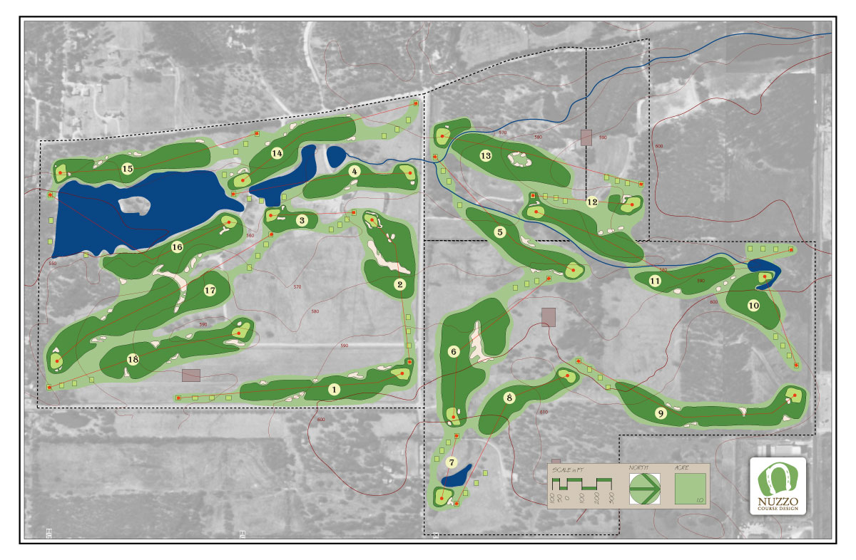 Bull Creek Golf Club - Arkansas In order to minimize construction expenses if the land is approprite, you can keep the clearing budget minimized, and play the golf through natural tree coridors, there by keeping the trees natural looking, and minimizing costs. The routing pictured at right keeps many of the natural coridors in tact. |