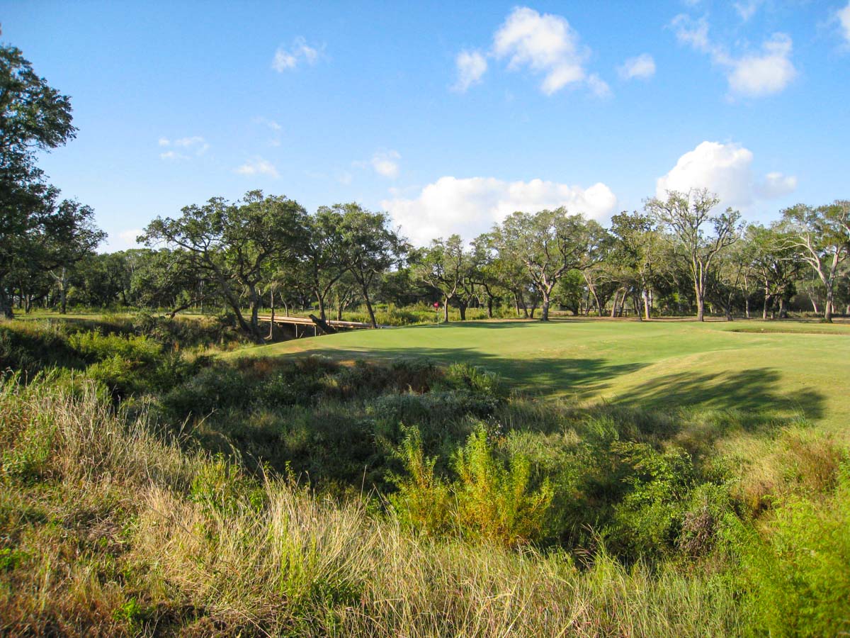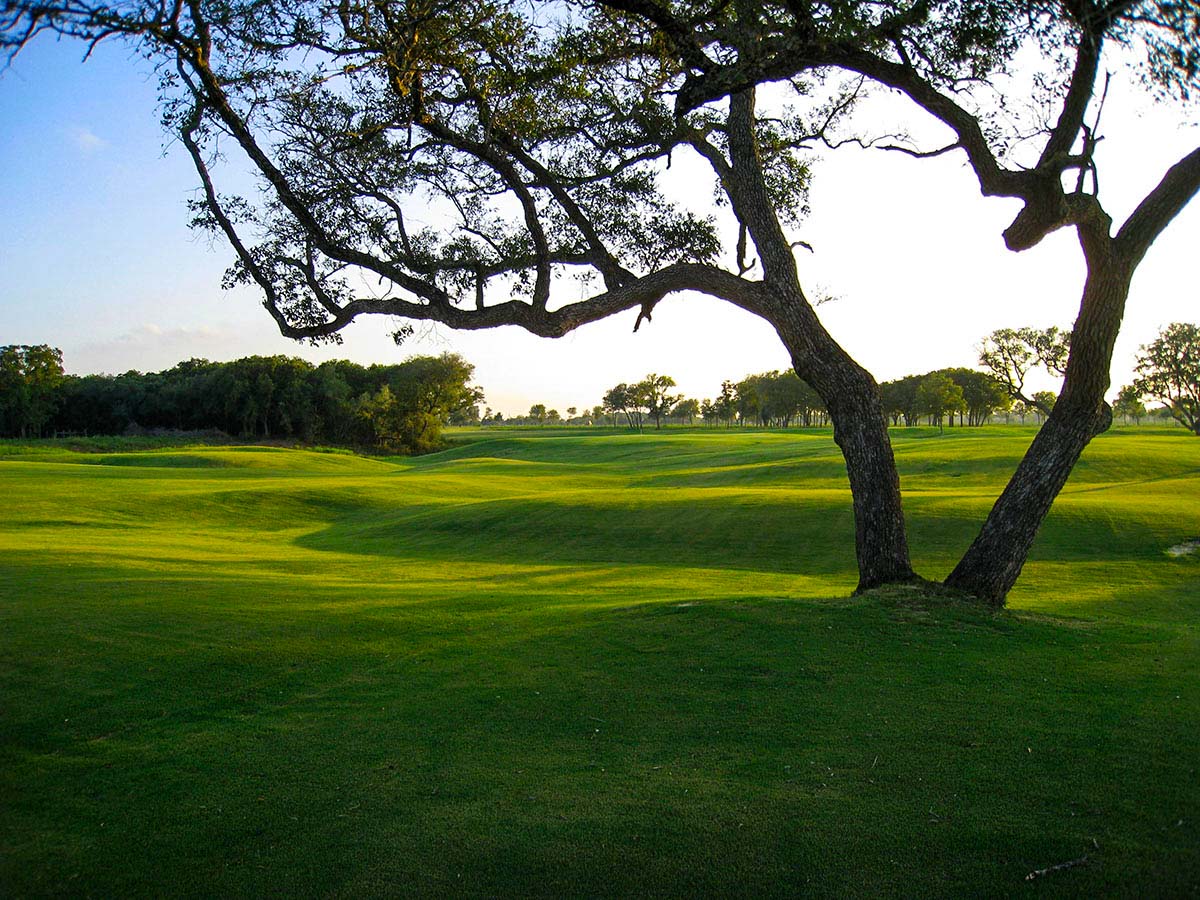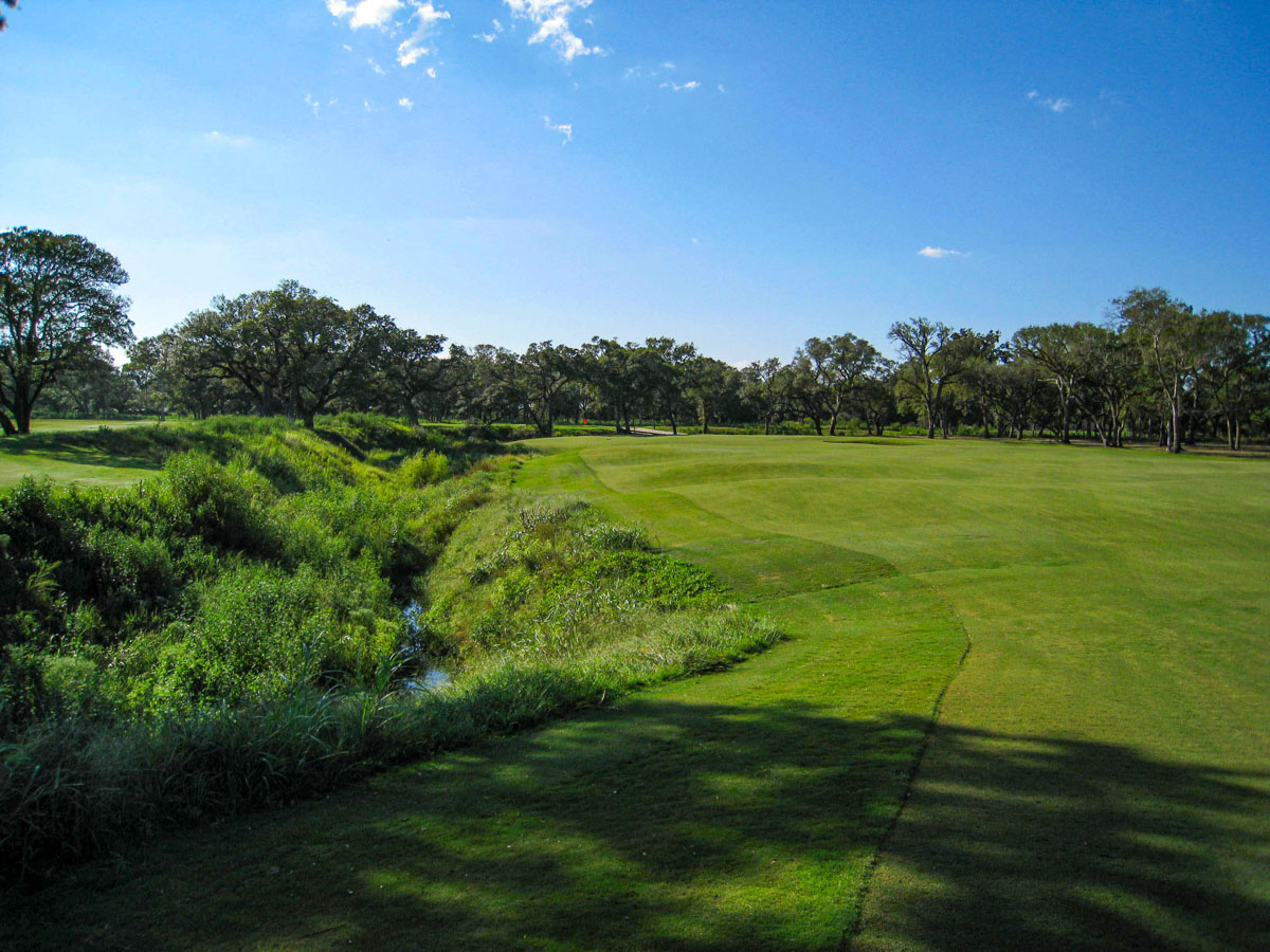 Looking back on the 14th hole, the large live oak splits the fairway.